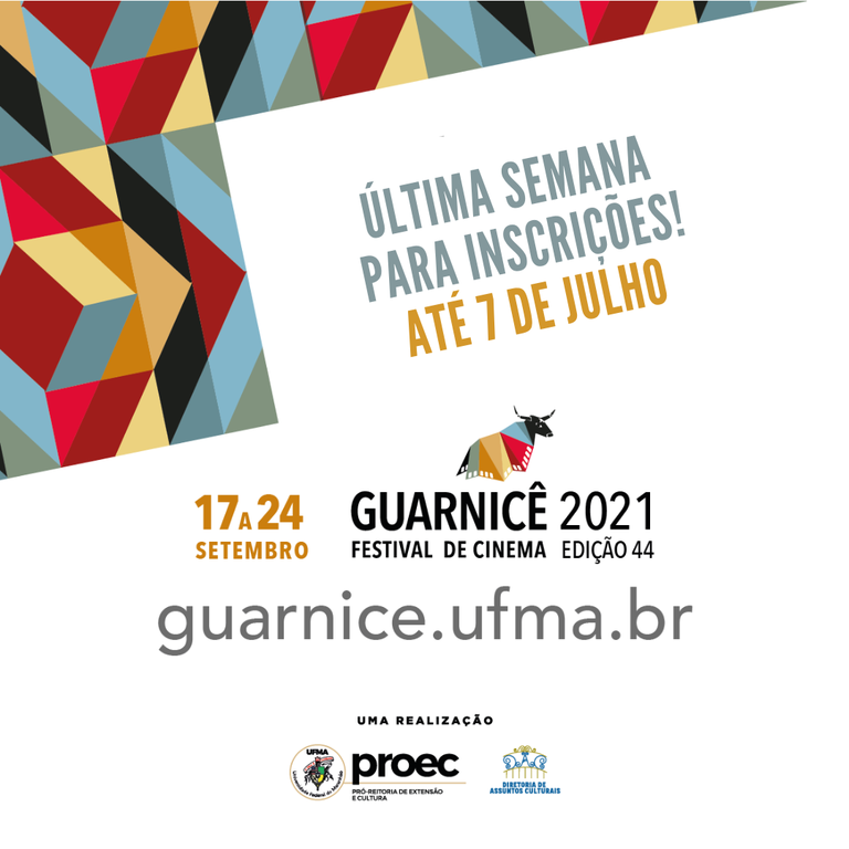 O Festival Guarnicê de Cinema 2021 – edição 44, que ocorrerá entre os dias 17 e 24 de setembro, no formato híbrido e promovido pela Pró-Reitoria de Extensão e Cultura (Proec) da Universidade Federal do Maranhão, terá suas inscrições encerradas na quarta-feira, 7. O evento é gratuito e podem participar brasileiros, ibero-americanos e de países de língua portuguesa, com idade mínima de 18 anos e com suas respectivas obras audiovisuais finalizadas a partir de outubro de 2019.