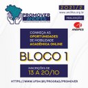Até quarta-feira, 20, estão abertas as inscrições do bloco 1 do Programa de Mobilidade Virtual em Rede de Instituições Federais de Ensino Superior (Promover Andifes) referentes ao semestre 2021.2. Para se inscrever, o estudante deve estar regularmente matriculado em uma instituição de ensino da rede e preencher um formulário on-line, informando seu CPF e sua data de nascimento, seguido do Código Promover da disciplina pretendida listada no Anexo I – Disciplinas do Bloco 1.