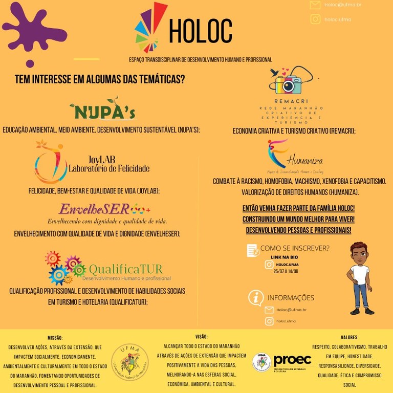 Abertas, até o dia 14, de agosto, as inscrições para a seleção de projetos de extensão vinculados ao Espaço Transdisciplinar de Desenvolvimento Pessoal e Profissional - Holoc. O público-alvo é a comunidade acadêmica, pessoas em situação de vulnerabilidade social, discentes, técnicos e docentes da UFMA. O projeto é de fluxo contínuo e coordenado pelo professor do curso de Hotelaria Cairo Cézar Sousa.