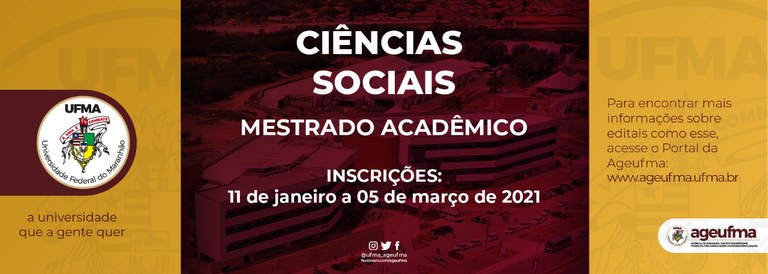 A Agência de Inovação, Empreendedorismo, Pesquisa, Pós-Graduação e Internacionalização (Ageufma) informa que as inscrições para a seleção ao Curso de Mestrado em Ciências Sociais, realizado pelo Programa de Pós-Graduação em Ciências Sociais, ocorrerão até o dia 5 de março deste ano. Para se inscrever, o candidato deve acessar o Sistema Integrado de Gestão de Atividades Acadêmicas (SIGAA) no link https://sigaa.ufma.br/sigaa/public/processo_seletivo/lista.jsf?aba=p-processo&nivel=S e preencher o formulário de inscrição, além de enviar a documentação pedida no edital. Os documentos devem ser anexados como arquivos virtuais legíveis em formato PDF.