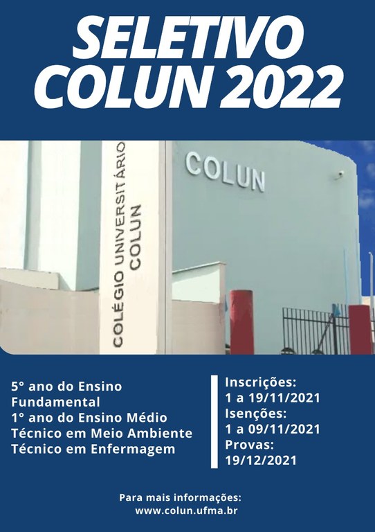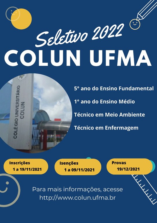 Estão abertas, até esta sexta-feira, 19, as inscrições para o seletivo 2022 do Colégio Universitário (Colun) da UFMA. O seletivo ocorrerá para ingresso de alunos no 5° ano do ensino fundamental, 1° ano do ensino médio regular, 1° ano do curso técnico de nível médio integrado em Meio Ambiente e no curso Técnico em Enfermagem na modalidade subsequente.