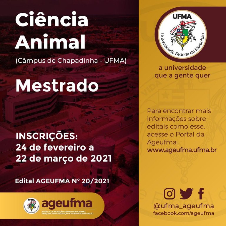 A Universidade Federal do Maranhão, por meio da Agência de Inovação, Empreendedorismo, Pesquisa, Pós-Graduação e Internacionalização (Ageufma), informa que estão abertas as inscrições para seleção de ingresso ao curso de Mestrado do Programa de Pós-Graduação em Ciência Animal do Centro de Ciências Agrárias e Ambientais, Câmpus Chapadinha, até o dia 22 de março deste ano.