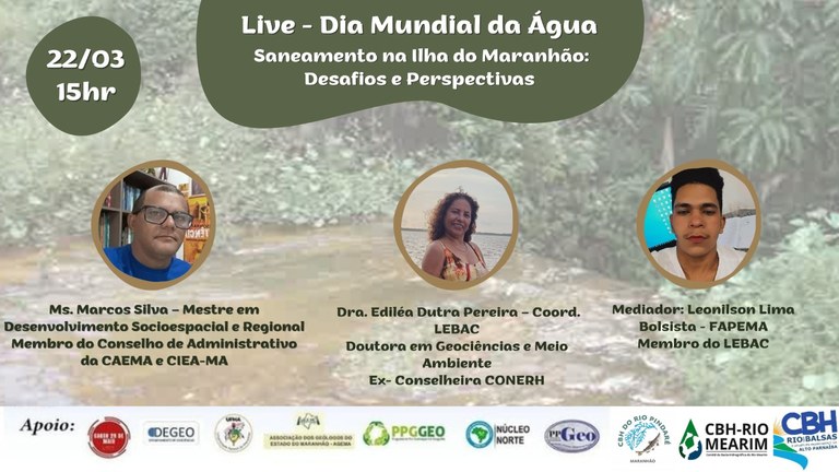 Ocorrerão, nessa terça-feira, 22, duas lives comemorativas ao Dia Internacional da Água, com os temas “Saneamento na Ilha do Maranhão: desafios e perspectivas”, com início às 15h, e “Recursos Hídricos do Maranhão: desafios e perspectivas”, a ser iniciada às 19h, pelo canal no Youtube do Laboratório de Bacias UFMA. O evento disponibilizará certificado para todos que participarem de ambas.