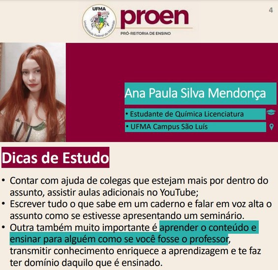 Os discentes apontaram as maiores dificuldades, destacaram os principais desafios e explicaram como fizeram para se adaptar ao EaD. Entre as principais questões, o ambiente e o acesso à internet foram os assuntos mais lembrados. Além disso, cada aluno apresentou as principais dicas que seguiu para conseguir se concentrar e estudar em casa. Foram ressaltadas também outras iniciativas da UFMA, como o Auxílio Pacote de Dados e o Caderno Dicas de Estudo.