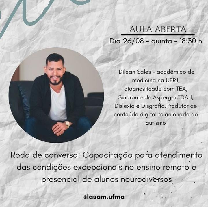 A aula conta com a participação do acadêmico de Medicina da Universidade Federal do Rio de Janeiro Dilean Sales, diagnosticado com Transtorno do Espectro Autista (TEA), Síndrome de Asperger, Transtorno do Déficit de Atenção com Hiperatividade (TDAH), Dislexia e Disgrafia. O palestrante compartilhará um pouco sua trajetória acadêmica e sua opinião a respeito dos conhecimentos necessários em relação à forma de aprendizagem de alunos neurodiversos.