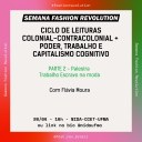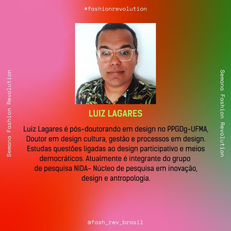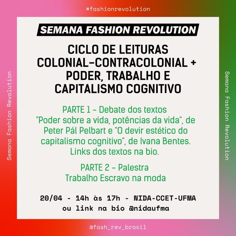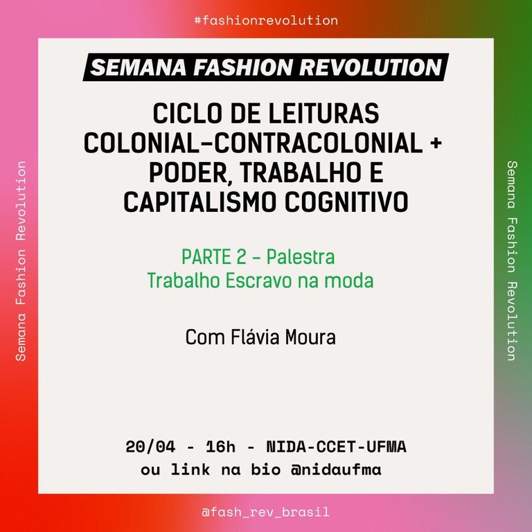 Membros do Núcleo de Pesquisas em Inovação, Design e Antropologia (Nida) e a docente da UFMA Flávia Moura, pesquisadora e coordenadora do Grupo de Estudos Trabalho Escravo e Comunicação (Getecom), participarão do “Ciclo de Estudos: Colonial contra Colonial”, na “Sessão Fashion Revolution: poder, trabalho e capitalismo cognitivo”, no dia 20 de abril, das 14h às 17h, de forma on-line e também presencial, na sede do Nida, no Centro de Ciências Exatas e Tecnologia, Câmpus São Luís.