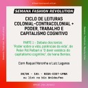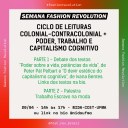 A Sessão faz parte do evento “Semana Fashion Revolution”, que será realizado entre os dias 18 e 24 de abril e debaterá, em duas partes, o biopoder relacionado ao capitalismo cognitivo, design, gênero e trabalho escravo. Na primeira etapa, haverá discussão baseada nos textos “Poder sobre a vida, potências da vida”, de Peter Pál Pelbart, e “O devir estético do capitalismo cognitivo”, de Ivana Bentes. Na segunda parte, Flávia Moura falará sobre o trabalho escravo na moda, contextualizando o trabalho escravo contemporâneo e o pensando a cadeia produtiva da moda no Brasil.