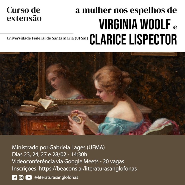 Do dia 23 a 24 e de 27 a 28 deste mês, a partir das 14h30, a mestranda do Programa em Pós-Graduação em Letras (PPGLetras) da Universidade Federal do Maranhão Gabriela Lages Veloso ministrará, via Google Meet, o curso de extensão “A Mulher nos Espelhos de Virginia Woolf e Clarice Lispector”, promovido pelo projeto “Literaturas Anglófonas”, do Departamento de Letras Estrangeiras Modernas da Universidade Federal de Santa Maria (UFSM), Rio Grande do Sul. Com a possibilidade também de assistir somente às gravações das aulas, os amantes da literatura poderão realizar suas inscrições até o dia 28, via site do curso, em que, inclusive, deverão efetuar o pagamento de taxa única de R$ 80 para participar.