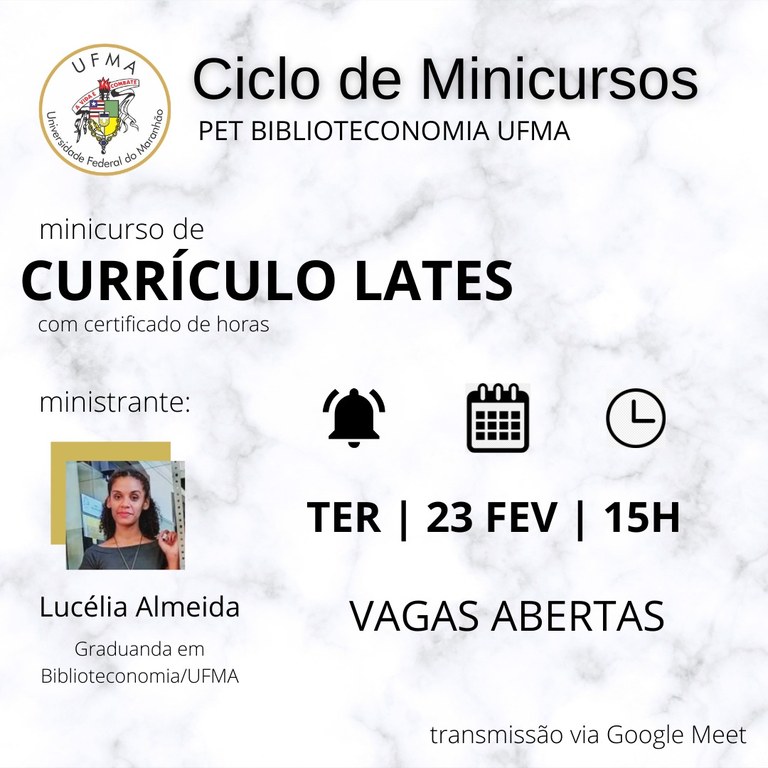 De forma gratuita, on-line e com direito a certificado de participação, na terça-feira, 23, a partir das 15h, o Programa de Educação Tutorial (PET) Biblioteconomia da Universidade Federal do Maranhão ofertará o Minicurso Currículo Lattes, que será ministrado por Lucélia Almeida, estudante do oitavo período do curso de Biblioteconomia da UFMA. A atividade será transmitida pelo Google Meet, e a participação pode ser garantida pela plataforma de inscrição do minicurso.