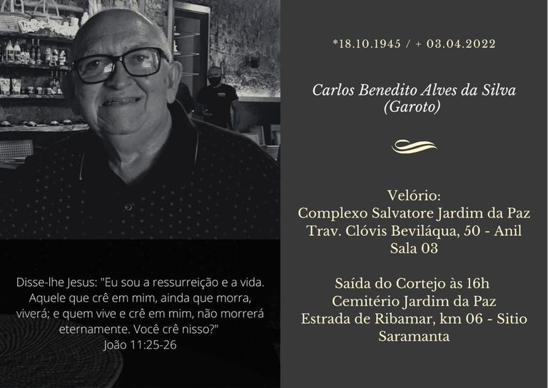 É com grande pesar que a Universidade Federal do Maranhão, por meio do Departamento de Comunicação Social do Câmpus São Luís, comunica o falecimento de Carlos Benedito Alves, pai do professor Carlos Benalves, ocorrido no dia 3 de abril. O enterro ocorreu no mesmo dia, no Cemitério Jardim da Paz, na Estrada de Ribamar.