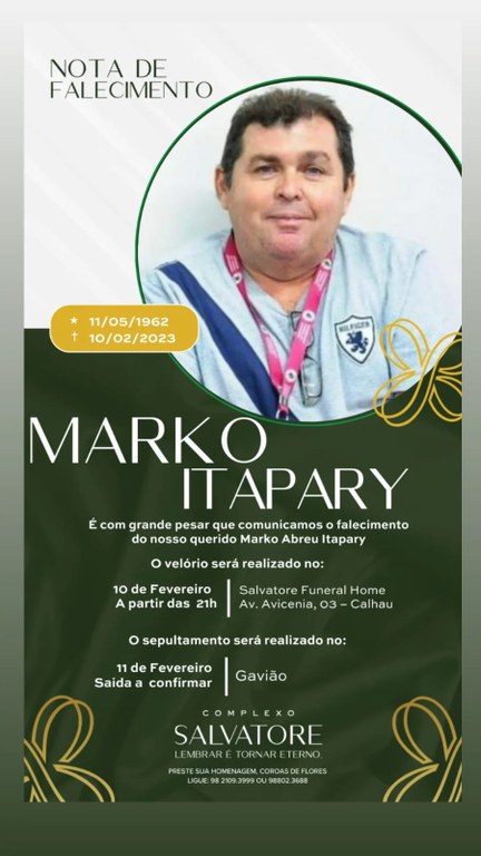 É com profundo pesar que a Universidade Federal do Maranhão comunica o falecimento do servidor Marko Abreu Itapary, da Diretoria de Assuntos Culturais da Pró-Reitoria de Extensão, ocorrido na sexta-feira, 10. Produtor Cultural, Marko é filho do poeta Joaquim Itapary e irmão do superintendente do Iphan no Maranhão, Maurício Itapary. O velório ocorreu no mesmo dia, na Salvatore Funeral Home, Calhau, e o sepultamento a ser realizado ainda hoje, 11, no Cemitério do Gavião, no bairro Belira.