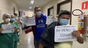 “Tenho só a agradecer ao nosso Deus, o dom da vida. Agradecer a cada profissional de São Luís que nos abraçou de uma forma especial. Só tenho a agradecer a este estado e estou muito feliz por estar voltando para a minha casa vivo”, pontua Samuel Rodrigues da Costa, segurando uma bandeira do Maranhão com as assinaturas de profissionais do HU-UFMA. Lembrança que será guardada com muito carinho para simbolizar a solidariedade entre os estados.