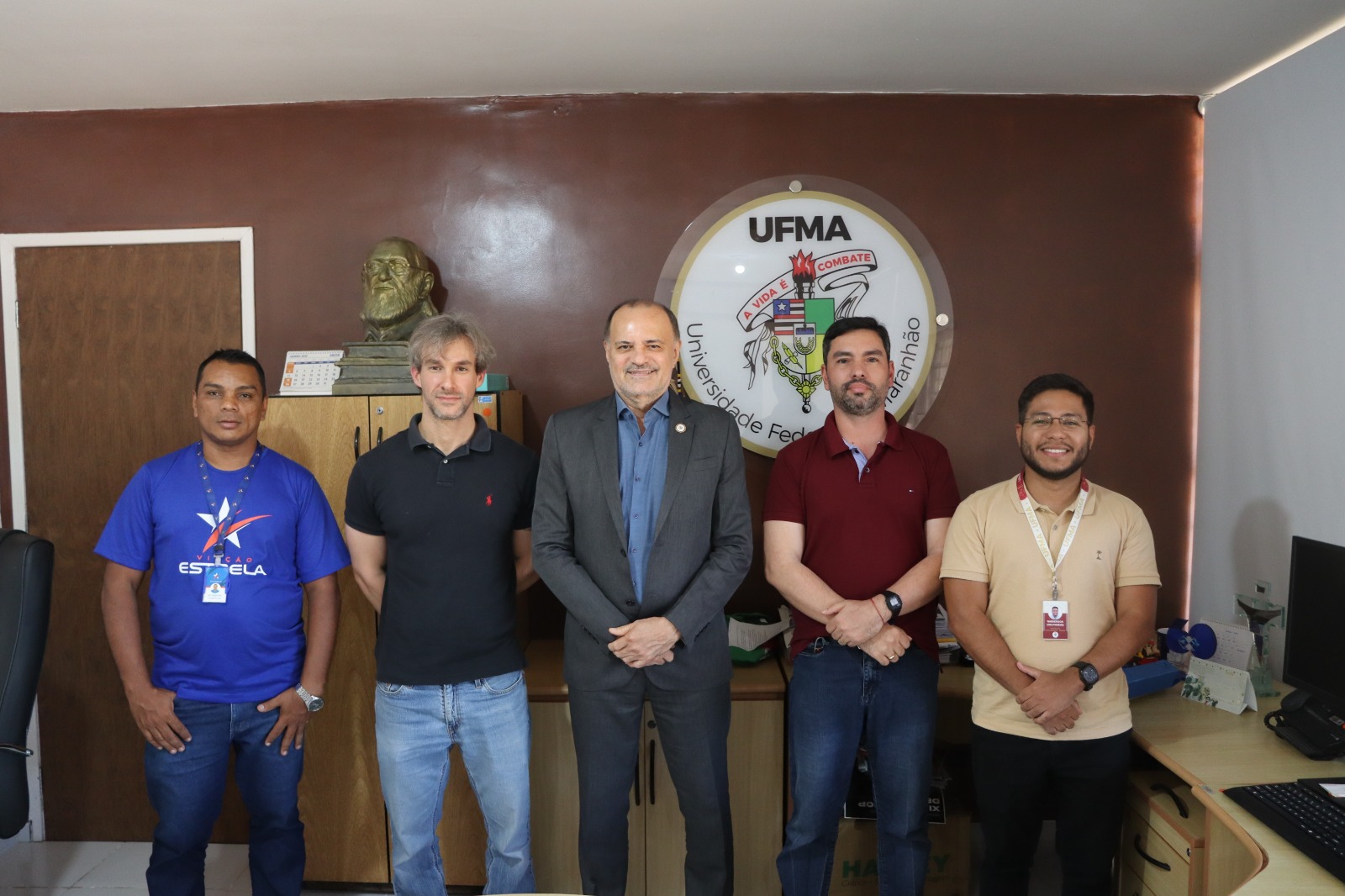 O reitor, Fernando Carvalho, ladeado por servidores da Sinfra e representante da empresa de transporte Viação Estrela.