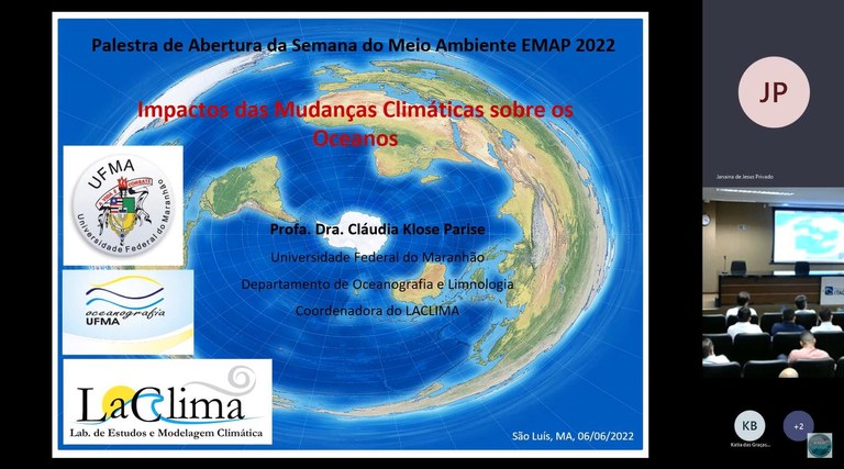 Em seguida, a professora Cláudia Kiose, também coordenadora do Laboratório de Estudos e Modelagem Climática (Laclima) da UFMA, iniciou as atividades da semana com a palestra de temática “Nós e o mar que queremos”, em que comentou que o Porto do Itaqui é um dos únicos do Brasil que já iniciou a redução de gases poluentes na atividade portuária. Ela enfatizou que o evento também precedeu as comemorações do Dia Mundial do Oceano e do profissional de oceanografia, no dia 8 de junho.