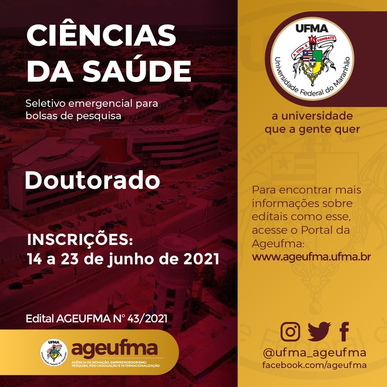 A Universidade Federal do Maranhão, por meio da Agência de Inovação, Empreendedorismo, Pesquisa, Pós-Graduação e Internacionalização (Ageufma), informa que estão abertas, no período de 14 a 23 deste mês, as inscrições para a seleção emergencial do Curso de Doutorado em Ciências da Saúde, oferecido pelo Programa de Pós-Graduação em Ciências da Saúde (PPGCS).