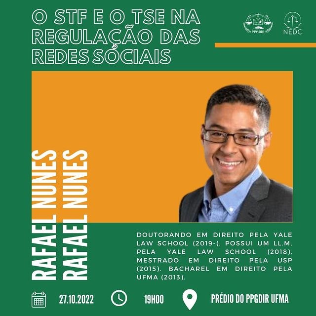 O Programa de Pós-Graduação em Direito e Instituições do Sistema de Justiça (PPGDir) realizarão, nessa quinta-feira, 27, com início às 19h, na sede do PPGDir, em frente ao Teatro Arthur Azevedo, no centro de São Luís, o seminário “O STF e o TSE na regulamentação das redes sociais”. O evento pretende discutir a atuação da justiça brasileira na regulação de discursos eleitorais on-line e contará com a palestra de Rafael Bezerra Nunes, graduado em Direito pela UFMA, atualmente concluindo seu doutorado em Direito de Estado pela Yale Law School, nos Estados Unidos.