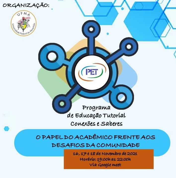 Entre os dias 16 e 18 de novembro, das 19h às 22h, de forma remota, pelo Google Meet, ocorrerá o Seminário Científico do Programa de Educação Tutorial (PET) Conexões de Saberes do Câmpus de Imperatriz, com o tema “O papel do acadêmico frente aos desafios da comunidade”. O prazo para submissões de trabalhos irá até o dia 7 de novembro, já as inscrições para participar das atividades do seminário irão até o dia 10.