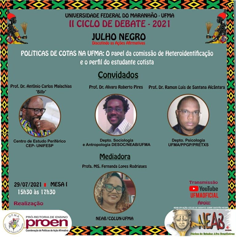 A Pró-Reitoria de Ensino da Universidade Federal do Maranhão, por meio da Coordenação de Políticas de Ação Afirmativa e do Núcleo de Estudo Afro-Brasileiro, realizará, nessa quinta-feira, 29, com início às 15h30, o Ciclo de Debates “Julho Negro Discutindo as Ações Afirmativas”, que terá como tema “Políticas de cotas na UFMA: o papel da Comissão de Heteroidentificação e o perfil do estudante cotista”. O Webinário será transmitido no Canal Institucional da UFMA no Youtube.