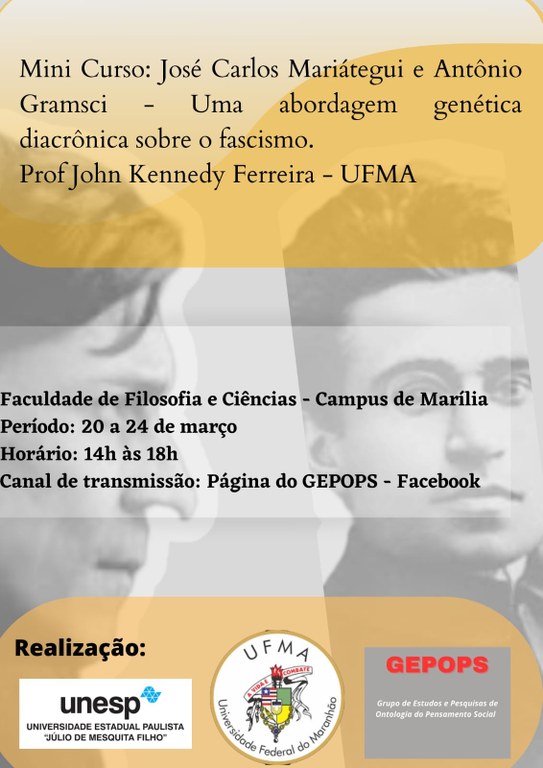 Foi iniciado, na segunda-feira, 20, o minicurso “José Carlos Mariátegui e Antonio Gramsci – Uma abordagem Genética Diacrônica Sobre o Fascismo”, ministrado pelo professor do curso de Sociologia do Câmpus São Luís John Kennedy Ferreira. A iniciativa é voltada para os alunos da da Universidade Federal do Maranhão e da Faculdade de Filosofia e Ciências da Universidade Estadual Paulista (Unesp), Câmpus de Marília. O minicurso se estenderá até essa sexta-feira, 24, em formato on-line, com direito a certificado.