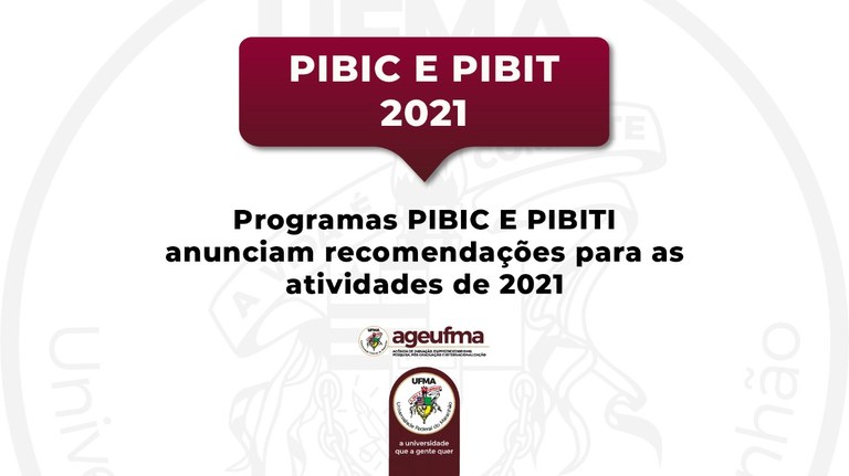 A Universidade Federal do Maranhão, por meio da Agência de Inovação, Empreendedorismo, Pesquisa, Pós-Graduação e Internacionalização (Ageufma), comunica as novas recomendações para o retorno das atividades dos programas de Iniciação Científica e Tecnológica (Pibic e Pibiti) ofertados pela Ageufma durante a execução do ensino emergencial. Os pesquisadores regularizados de 2020-2021 poderão dar continuidade ao cronograma de plano de trabalho dos estudantes (bolsistas e/ou voluntários).