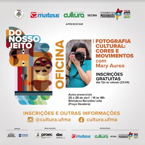Em mais uma ação do projeto “Do Nosso Jeito”, a Universidade Federal do Maranhão realizará três ações formativas entre os dias 25 e 29 de abril. Serão promovidas oficinas de fotografia cultural, dança de ritmos populares e práticas musicais. As inscrições são gratuitas e ocorrem até às 12h de sábado, 23, pelo Google Forms. Cada oficina oferecerá 20 vagas, que serão preenchidas de acordo com a ordem de inscrição.