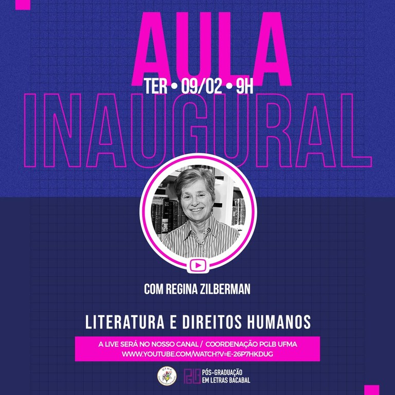 Abordando a temática “Literatura e Direitos Humanos”, a doutora em Romanística pela Universidade de Heidelberg e pós-doutora pelo University College, na Inglaterra, Regina Zilberman, ministrou a Aula Inaugural Virtual do Programa de Pós-Graduação em Letras do Câmpus de Bacabal na terça-feira, 9.