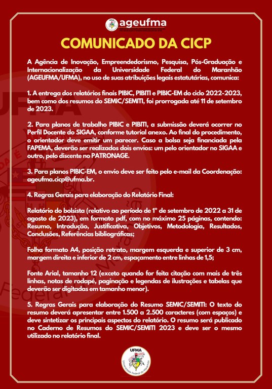 A Coordenação dos Programas Pibic e Pibiti da Ageufma-UFMA anunciou hoje, 31, a prorrogação do prazo para a entrega dos relatórios finais dos ciclos 2022-2023 dos Programas Institucionais de Bolsas de Iniciação Científica (Pibic), Bolsas de Iniciação em Desenvolvimento Tecnológico e Inovação (Pibiti) e Bolsas de Iniciação Científica para o Ensino Médio (Pibic-EM). Além disso, a prorrogação também se estende aos resumos do Seminário de Iniciação Científica (Semic) e Seminário de Iniciação em Desenvolvimento Tecnológico e Inovação (Semiti).