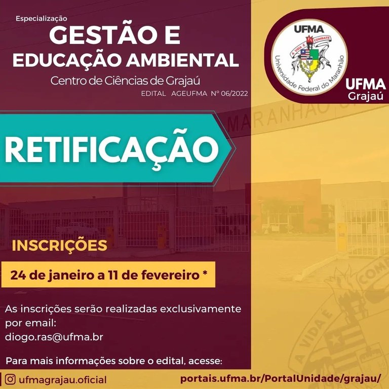 Estão abertas, até o dia 11 de fevereiro, as inscrições para o Curso de Especialização em Gestão e Educação Ambiental do Câmpus de Grajaú, promovido pela Agência de Inovação, Empreendedorismo, Pesquisa, Pós-Graduação e Internacionalização (Ageufma). São ofertadas cinquenta vagas para graduados em cursos das áreas de ciências humanas, ciências naturais, ciências ambientais e educação.
