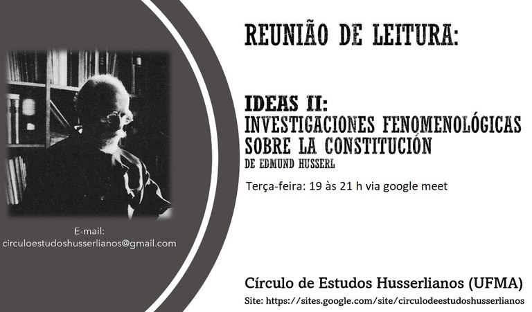 Com o objetivo de promover a integração e o aprofundamento em Fenomenologia e Psicologia na Orientação Husserliana, todas as terças-feiras, até o final deste ano, de forma remota, pelo Google Meet, das 19h às 21h, ocorrem as reuniões semanais do Círculo de Estudos Husserlianos (CEH) do Centro de Ciências Humanas (CCH) da Universidade Federal do Maranhão, com o tema “Ideas II: Investigaciones Fenomenológicas sobre la constitución de Edmund Husserl”. Os interessados deverão enviar um e-mail para circulodestudoshusserlianos@gmail.com para participar dos encontros.