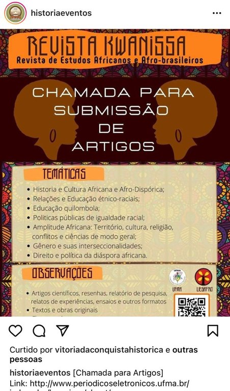 A Revista de Estudos Africanos e Afro-Brasileiros – Kwanissa, uma revista científica vinculada à Licenciatura em Estudos Africanos e Afro-Brasileiros da Universidade Federal do Maranhão, realiza chamada contínua para submissão de artigos, dentro das temáticas de “História e Cultura Africana e Afrodaispórica”; “Relações e Educação étnico-raciais”, “Educação quilombola”, “Políticas Públicas de Igualdade Racial”, “Amplitude Africana: Território, cultura, religião, conflitos e ciência de modo geral”, “Gênero e suas interseccionalidades”, “Direito e política da diáspora africana”.