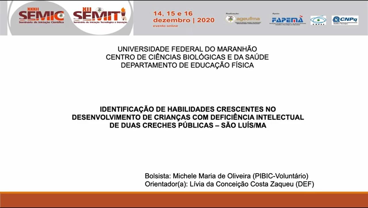 O objetivo principal da pesquisa é identificar, em duas creches públicas do município de São Luís, habilidades crescentes em nove áreas chave do desenvolvimento de crianças com deficiência intelectual (DI): postura passiva; postura ativa; locomotor; manipulativo; visual; audição e linguagem; fala e linguagem; social interativo; e autocuidado social.