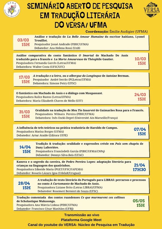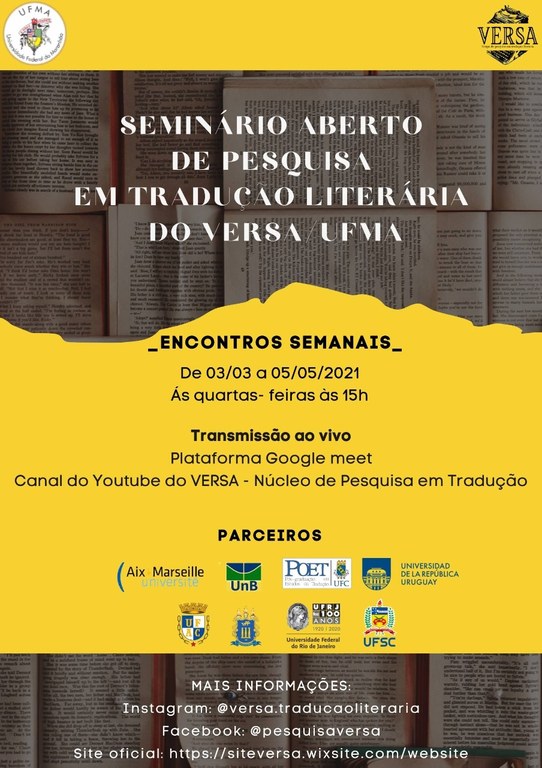 Terá início no dia 3 de março, às 15h, o Seminário Aberto de Pesquisa em Tradução Literária, por meio do canal do Youtube do Núcleo de Pesquisa em Tradução Versa, sob a coordenação da professora Emilie Audigier, docente do curso de Letras - Francês do Câmpus São Luís. O evento será realizado todas as quartas-feiras, até o dia 5 de maio e terá foco na apresentação de pesquisas Pibic e mestrado do Versa, contando com professores debatedores nacionais convidados da Universidade de Brasília (UnB), Universidade Federal do Acre (Ufac), Universidade Federal do Ceará (UFC), Universidade Federal de Santa Catarina (UFSC), Universidade Federal do Rio de Janeiro (UFRJ) e participantes internacionais da Universidade Aix-Marseille, na França, e Universidad de la República, no Uruguai.