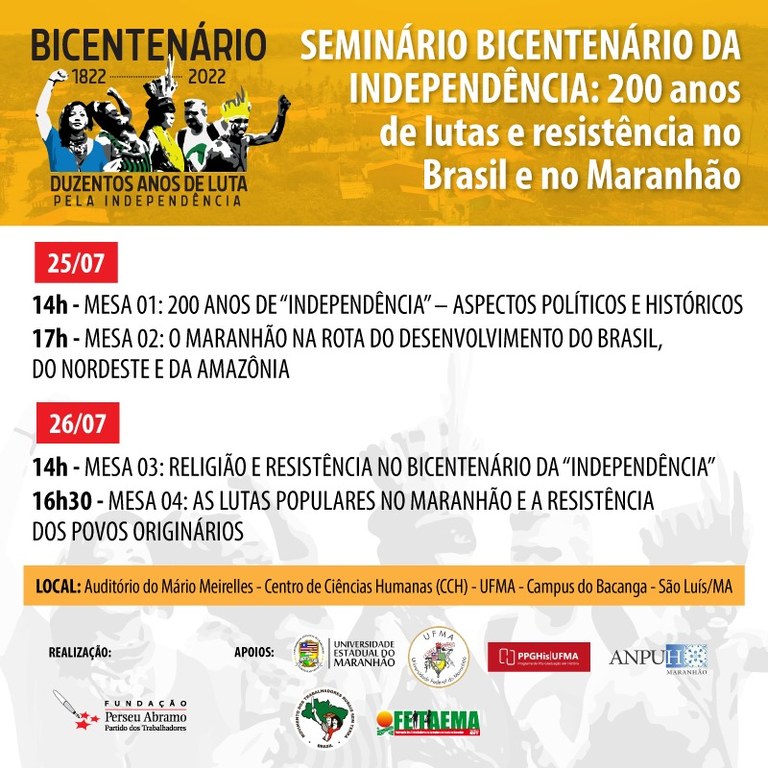 Evidenciar a relação entre história e política à luz das interpretações sobre o passado é o objetivo do Seminário Bicentenário da Independência sobre os 200 anos de luta e resistência no Brasil e no Maranhão, que é realizado de hoje, 25, até essa terça-feira, 26, no auditório Mário Meirelles, do Centro de Ciências Humanas da UFMA, na Cidade Universitária Dom Delgado.