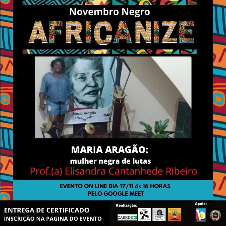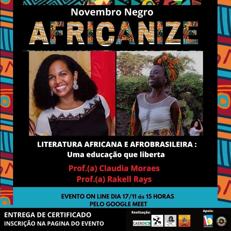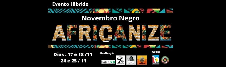 Terá início, nessa quarta, 17, a série de palestras “Novembro Negro – Africanize”, promovida pelo Centro Acadêmico de Enfermagem Rosilda Dias (Caerd), a Mídia Maria Firmina e o Coletivo Negro da UFMA (Conegru). O evento irá até o dia 25 e reunirá rodas de conversa, atividades em literatura, quadrinhos africanos e outros fatores relacionados à vivência e à cultura negra. Toda a série de palestras será transmitida por meio do Google Meet, com inscrições disponíveis on-line, mediante taxa de R$ 5 a R$ 10.