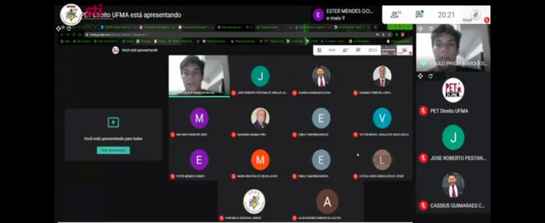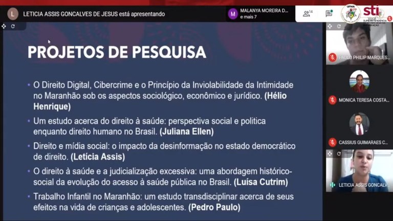 Teve início ontem, quarta-feira, 10, a Semana da Caloura e do Calouro de Direito 2020.2. O evento foi mediado pelo discente Paulo Philip e transmitido pelo canal no Youtube STI UFMA, para mais de noventa pessoas. A programação contou com a apresentação de grupos de pesquisa e extensão e associações acadêmicas, garantindo certificação aos participantes de oito horas complementares.