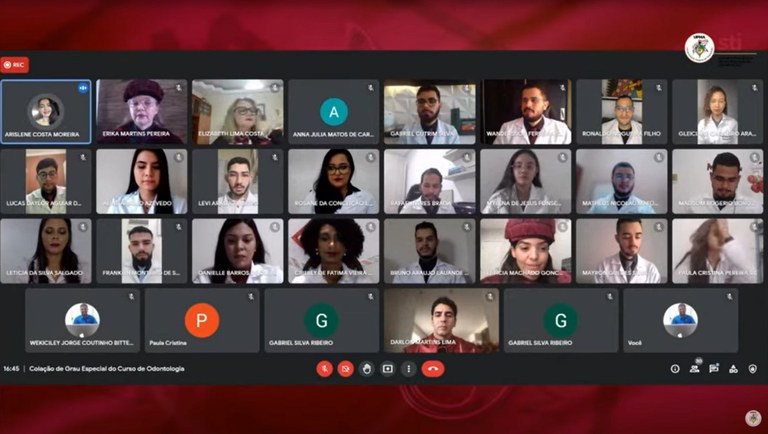De forma remota, a Universidade Federal do Maranhão realizou, na terça-feira, 18, a solenidade de colação de grau especial da turma 132 do curso de Odontologia do Centro de Ciências Biológicas e da Saúde (CCBS), referente ao primeiro semestre de 2021. A cerimônia foi presidida pela coordenadora do curso, a professora Erika Martins Pereira, representando o reitor Natalino Salgado, e a mesa contou ainda com a paraninfa, Letícia Machado Gonçalves, a patronesse, Elizabeth Lima Costa, e o representante da turma, Darlon Martins Lima.