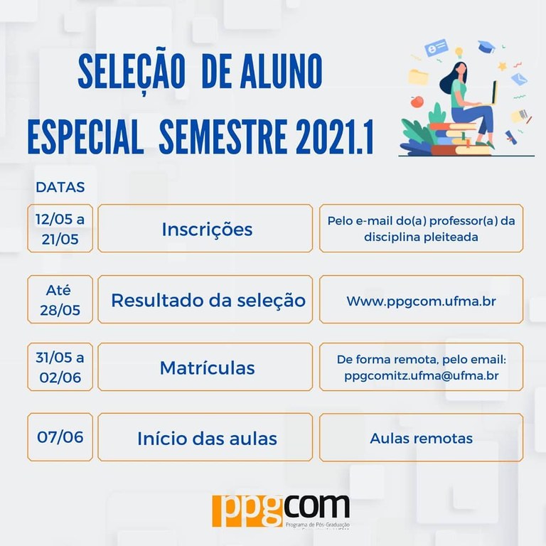 O Câmpus de Imperatriz da Universidade Federal do Maranhão, por meio do Programa de Pós-Graduação em Comunicação (PPGCOM), abriu processo seletivo simplificado de aluno especial para o Mestrado em Comunicação, referente ao primeiro semestre letivo de 2021, e o período de inscrições vai de 12 a 21 deste mês.