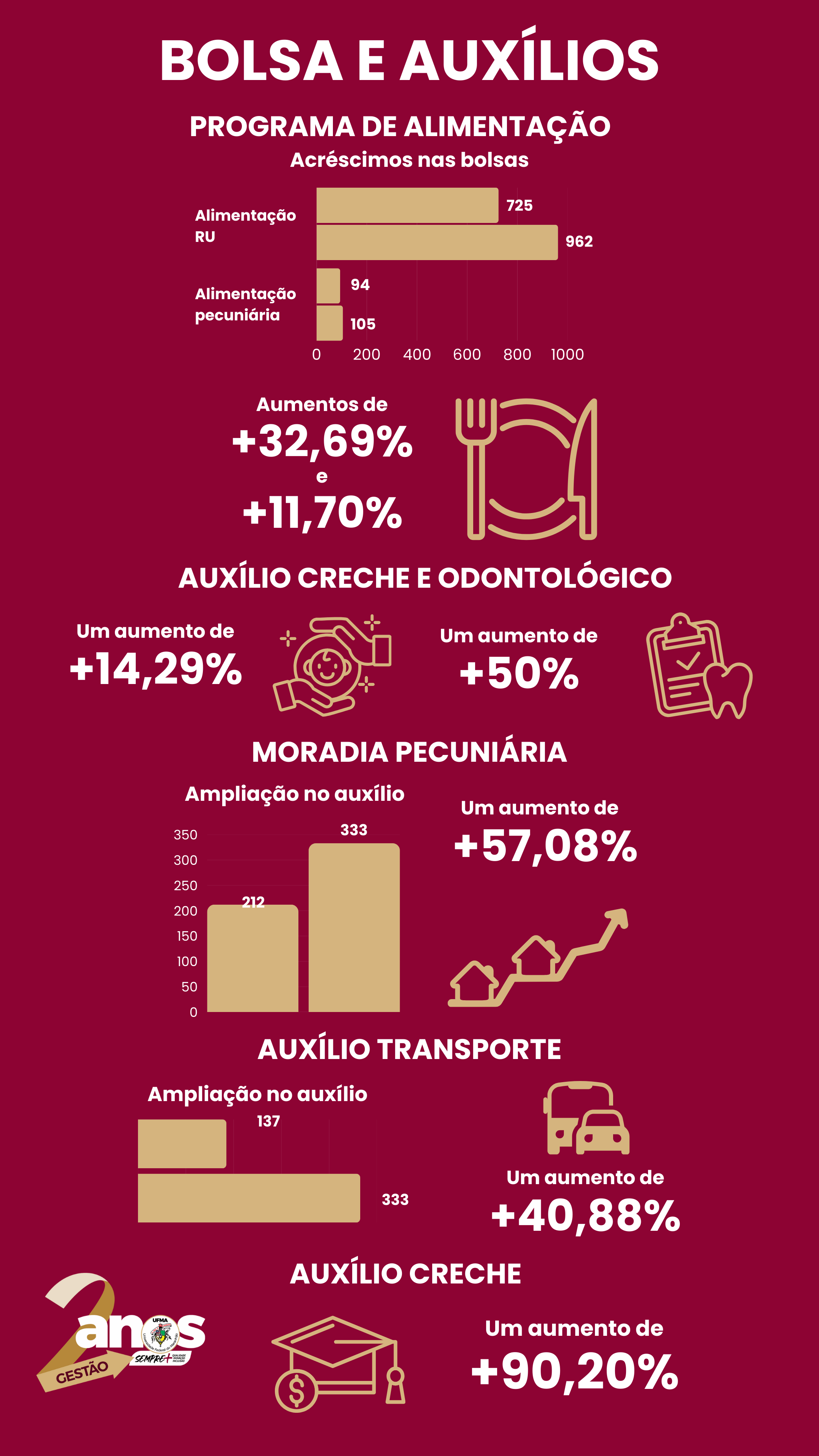 Ainda na atual gestão, houve ampliação e integração dos benefícios, como o Auxílio Alimentação, que passou a ter vínculo automático com o auxílio Creche, Moradia Pecuniária e Emergencial. Na prática, os estudantes inseridos nesses programas passam ter acesso gratuitamente à alimentação disponibilizada nos restaurantes universitários, tanto no câmpus de São Luís quanto nos oito câmpus do interior.