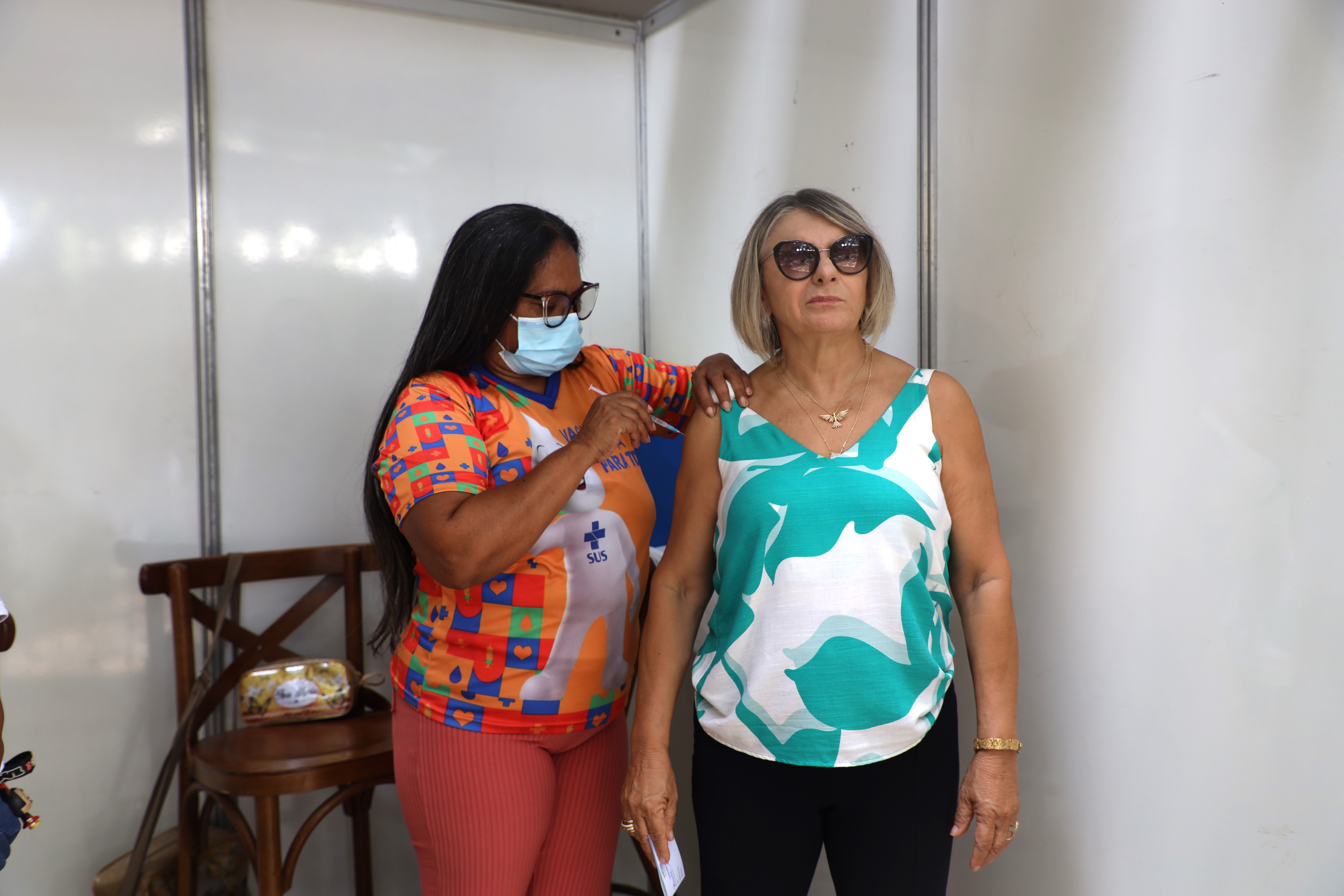 A servidora aposentada Maristela Araújo aproveitando o serviço de vacinação. Foto: Giovanna Carvalho