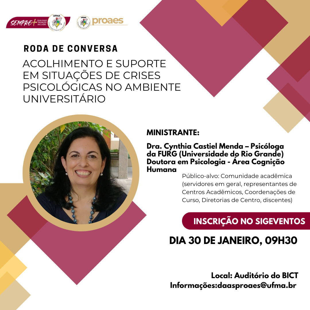 Seguindo proposta semelhante, aberto a toda a comunidade acadêmica, haverá a roda de conversa “Acolhimento e suporte em situações de crises psicológicas no ambiente acadêmico”, mediada pela psicóloga da Universidade Federal do Rio Grande do Sul (FURG) e especialista em cognição humana, Cynthia Castiel.
