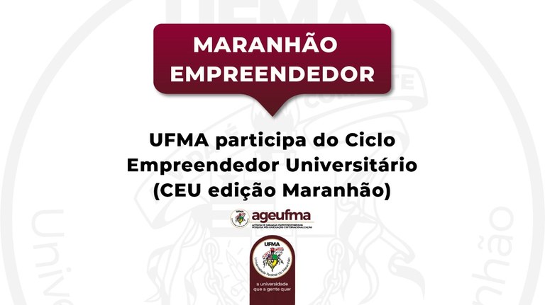 A Universidade Federal do Maranhão, por meio da Agência de Inovação, Empreendedorismo, Pesquisa, Pós-Graduação e Internacionalização (Ageufma), participa, no mês de maio deste ano, do “CEU pelo Brasil”, evento do Ciclo Empreendedor Universitário (CEU), que será realizado no Maranhão em painéis toda terça-feira, com transmissão ao vivo, por meio do Youtube, das 19h às 20h30.