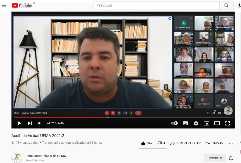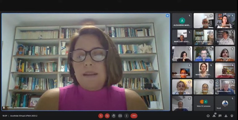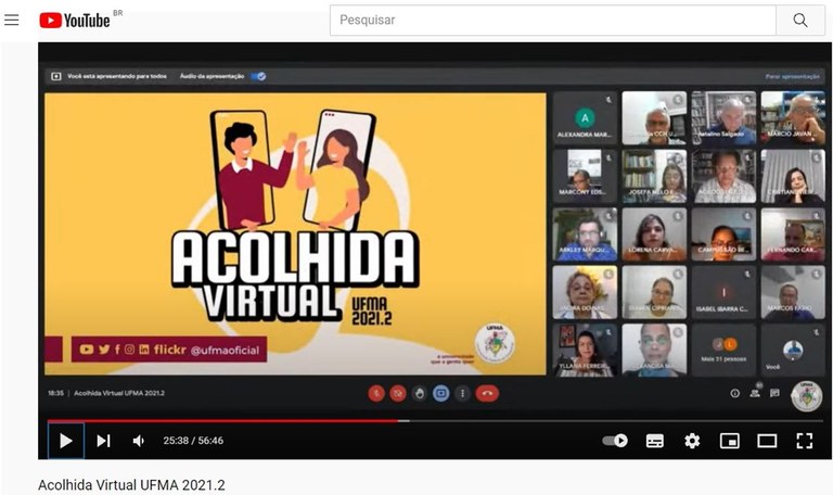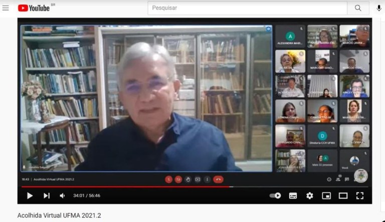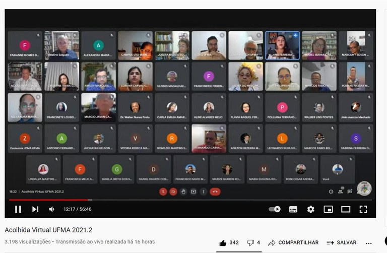 A cerimônia de acolhida virtual contou, na mesa simbólica, com o reitor da UFMA, Natalino Salgado Filho; o vice-reitor da Universidade, Marcos Fábio Belo Matos; a pró-reitora de Ensino (Proen), Isabel Ibarra Cabrera; o pró-reitor de Assistência Estudantil (Poaes), Leonardo Silva Soares; o diretor do Centro de Ciências Humanas (CCH), Francisco de Jesus Silva de Sousa, representando todos os diretores de Centro e de Câmpus da Universidade; a coordenadora do curso de Engenharia de Pesca, Câmpus Pinheiro da UFMA, Yllana Ferreira Marinho, representando todos os coordenadores de curso da Universidade; e o presidente do Diretório Central dos Estudantes (DCE) da UFMA, Marcony Edson Silva de Matos, estudante de Oceanografia da UFMA.