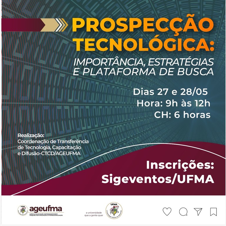A Universidade Federal do Maranhão, por meio da Agência de Inovação, Empreendedorismo, Pesquisa, Pós-Graduação e Internacionalização (Ageufma), informa que já estão abertas as inscrições para participar do minicurso sobre Prospecção Tecnológica, que ocorrerá nos dias 27 e 28 deste mês, das 9h às 12h. Na ocasião, serão discutidos temas como: a importância, as estratégias e a plataforma de busca sobre o tema.