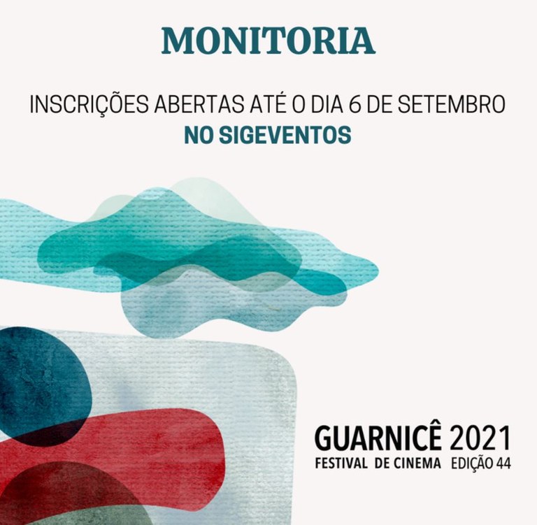 Hoje, 6 de setembro, é o último dia de inscrições para monitoria nas ações formativas do Guarnicê. Os interessados podem se inscrever no Sigeventos, e as vagas são exclusivas para estudantes da Universidade Federal do Maranhão (UFMA). As oficinas e os minicursos terão duas vagas para monitores e carga horária de 20 horas. As masterclasses terão somente uma vaga e carga horária de quatro horas. Os monitores auxiliarão a organização das ações formativas e facilitarão a comunicação entre ministrantes e ouvintes