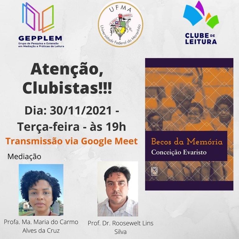 Ocorreu, na terça-feira, 30, o último debate do ano realizado pelo Clube de Leitura do Grupo de Pesquisa Extensão em Mediação e Práticas de Leitura (Gepplem), do Departamento de Biblioteconomia da Universidade Federal do Maranhão. A obra “Becos da Memória”, de Conceição Evaristo, foi o destaque do evento. O encontro dos integrantes do grupo foi pela plataforma virtual Google Meet e teve a participação de alunos, professores e bibliotecários que fazem parte do clube de leitura.