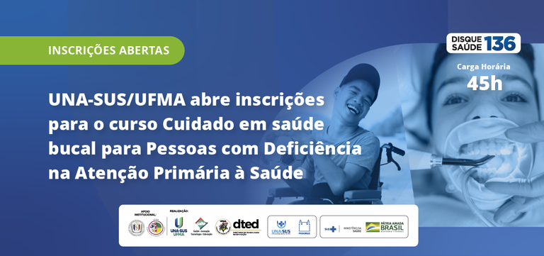 A Universidade Aberta do SUS (UNA-SUS) na Universidade Federal do Maranhão anunciou na terça-feira, dia 27, o lançamento do curso “Cuidado em Saúde Bucal para Pessoas com Deficiência na Atenção Primária à Saúde”. O curso é totalmente gratuito e on-line. As inscrições poderão ser realizadas até o dia 4 de janeiro de 2022, por meio do Saiteava.