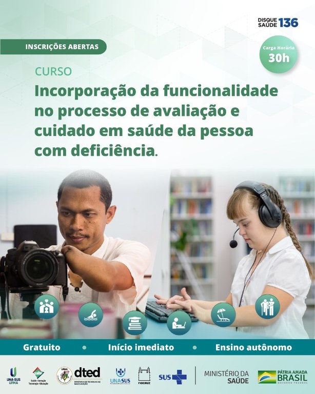 Estão abertas as matrículas para o curso Incorporação da funcionalidade no processo de avaliação e cuidado em saúde da pessoa com deficiência, ofertado pela Universidade Federal do Maranhão — instituição integrante da Rede UNA-SUS (UNA-SUS-UFMA). As inscrições podem ser efetuadas até o dia 27 de abril de 2023 na plataforma Saiteava.org. A oferta educacional é on-line, gratuita, certificada, e o início das aulas é imediato.