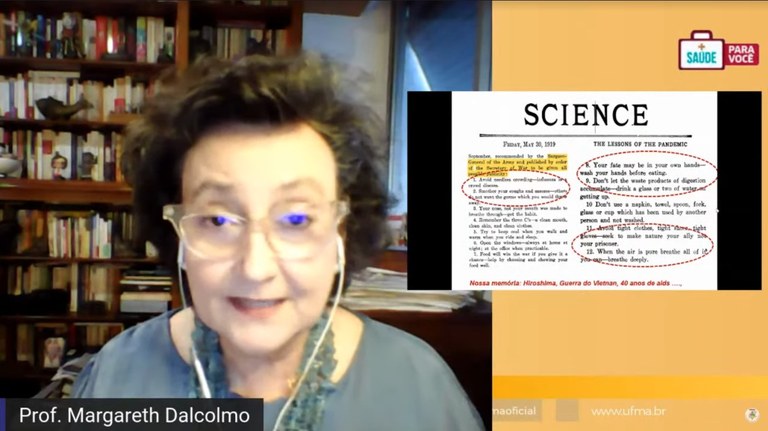 Na transmissão, disponível no portal e no Canal Institucional da UFMA no Youtube, a pneumologista disserta sobre a história das epidemias assimilando à história da humanidade, explicando os princípios da história do coronavírus e suas variantes, que foram descobertas ao longo de anos de pesquisa e com ajuda das várias epidemias registradas ao longo do tempo. Margareth lembrou que na história dessas epidemias, as medidas não-farmacológicas, como usar máscara, isolamento, lavar as mãos e o distanciamento social, além do uso de produtos sanitizantes, ajudaram a evitar o contágio e neutralizar a reprodução do vírus.