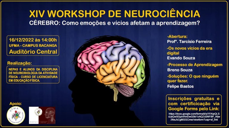 A 14ª edição do Workshop de Neurociência ocorrerá nessa sexta, 16, a partir das 14h, no Auditório Central da UFMA, Cidade Universitária, abordando o tema “Cérebro: como emoções e vícios afetam a aprendizagem”. Os interessados podem realizar a inscrição gratuita de modo on-line, em que receberão o certificado referente à participação diretamente no e-mail cadastrado.
