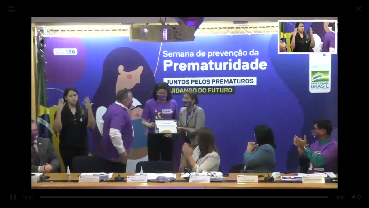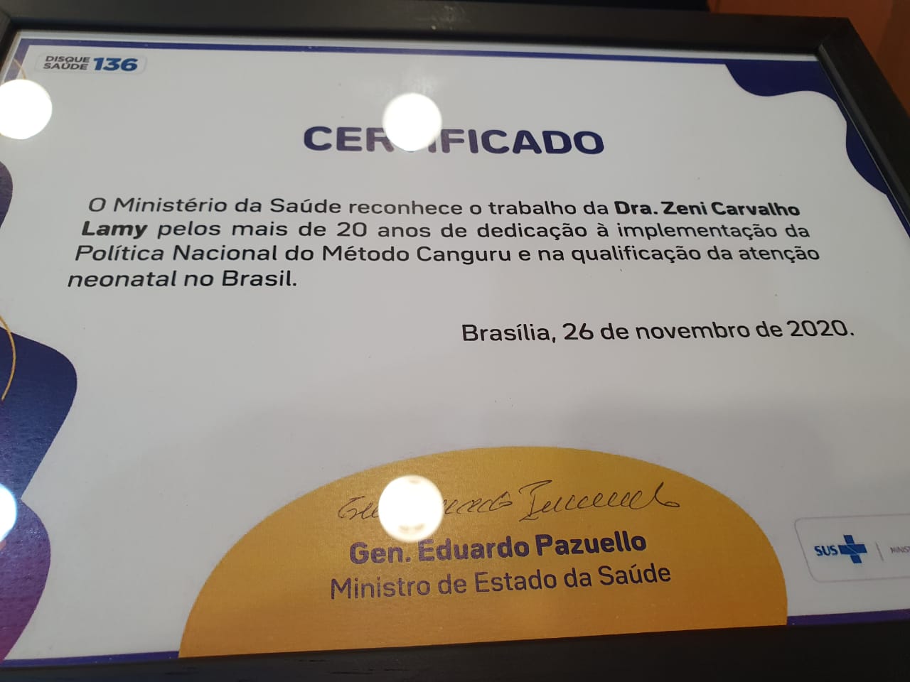 SÃO LUÍS – Em honra e gratidão pelos 20 anos de trabalho na implantação, no desenvolvimento científico, ativismo e na orientação na formação de profissionais para o Método Canguru, a professora do Departamento de Saúde Pública e do Programa de Pós-Graduação em Saúde Coletiva Zeni Carvalho Lamy recebeu uma homenagem das mãos do Ministro da Saúde, Eduardo Pazuello, no dia 26 de novembro, em Brasília. A docente é precursora na implantação do método no Maranhão, precisamente no Hospital Universitário (HU-UFMA), em 1997 e no Brasil, integrando a equipe que iniciou o Método Canguru como Política Nacional de Saúde do Ministério da Saúde, no ano 2000.